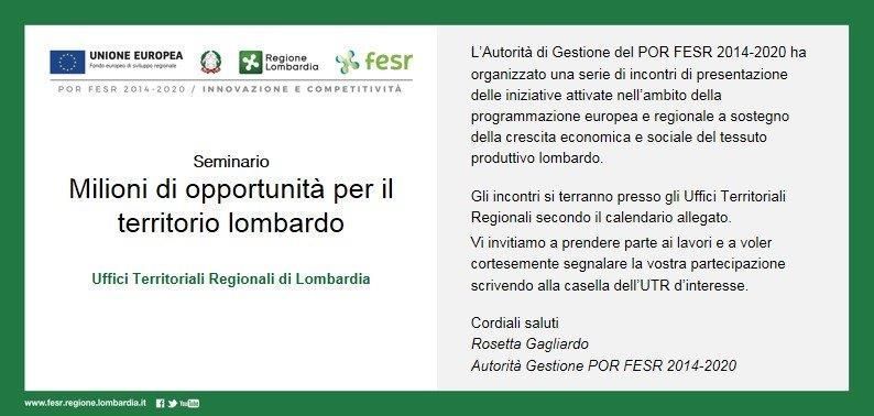 Con la grande partecipazione di cittadini, imprese e stakeholder come partner e protagonisti delle iniziative presentate, il Tour ha trasformato le sedi degli Uffici Territoriali Regionali in luoghi di incontro e confronto con i referenti di Regione Lombardia sul tema dei fondi di finanziamento europei. Tra questi, Rosetta Gagliardo, Autorità di Gestione POR FESR 2014-2020 (Direzione Generale “Università, Ricerca e Open Innovation”) ed Ermanno Boccalari, Dirigente presso  la Direzione Generale  Università, Ricerca  e Open Innovation (Autorità di Gestione POR FESR 2007-2013).